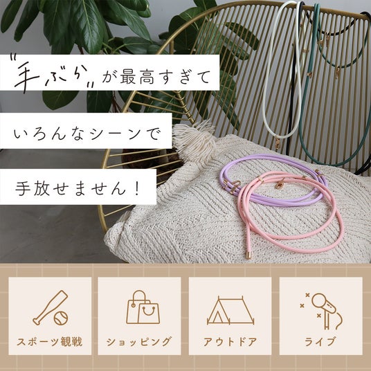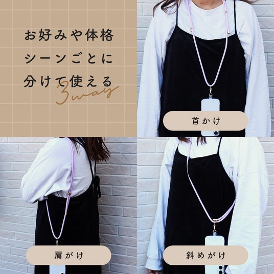 首・肩・斜めがけの3Wayで使用できるスマートフォンショルダーストラップです。