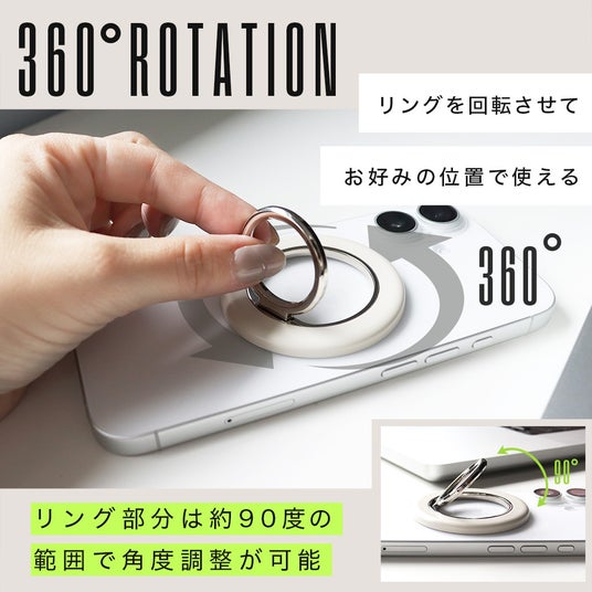 Magsafe対応 マグネット式で取り外しも簡単なスマホリングです。片手操作を安定させるだけでなく、360度回転式でスマホスタンドとしても使用できるのが魅力です。