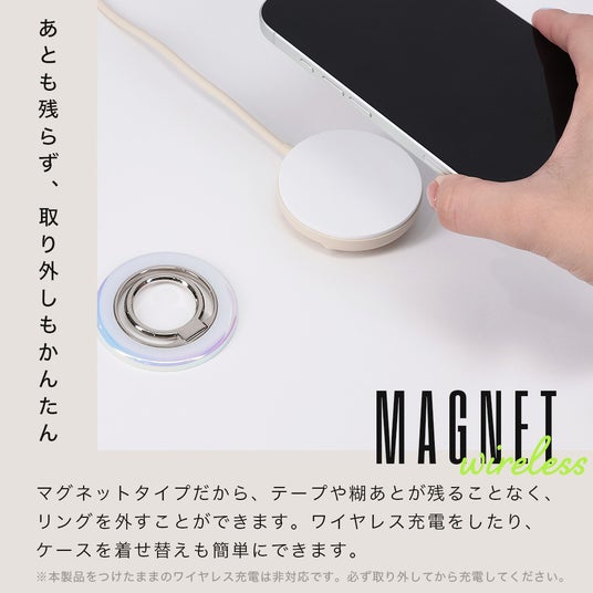 マグネットタイプなので、リングの取り外しが簡単にでき、ワイヤレス充電や、ケースの着せ替えも快適に行えます。