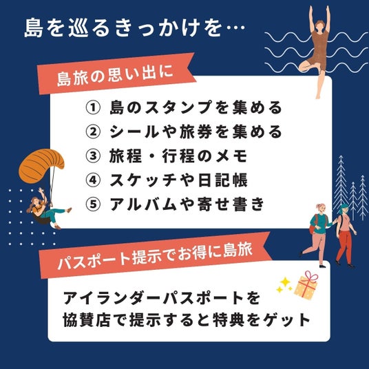 マット銀箔を施した高級感のあるパスポートサイズの旅手帳で、スタンプや切手、シール集めから旅の思い出日記まで使い方は様々。さらに、島の協賛店で提示すると様々な特典を受けられる。