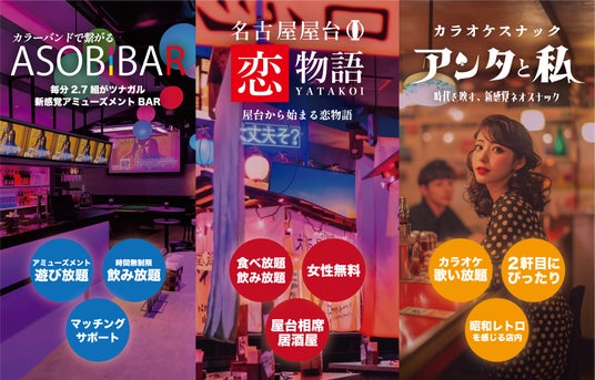 中でも注目は3階部分にオープンする 「マッチングのナイトマーケット」。全国で話題を集めるカラーで繋がるアミューズメントバー 「ASOBIBAR」、女性が完全無料で楽しめる屋台型マッチングスポット 「名古屋屋台恋物語(ヤタコイ)」、そして昭和レトロをテーマにしたカラオケバー 「アンタと私」 の3大ブランドが勢ぞろいします。