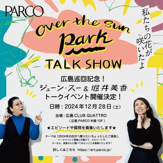 広島PARCO( 広島県広島市中区)とTCエンタテインメント株式会社(本社:東京都港区、以下TCエンタテインメント)は、2024年12月28日(土)から2025年1月13日(月・祝)まで、広島PARCO 本館6F PARCO FACTORYにて、TBSラジオによる大人気Podcast番組『ジェーン・スーと堀井美香の「OVER THE SUN」』による展覧会『OVER THE SUN PARK~私たちの花が咲いたよ~』を開催いたします。