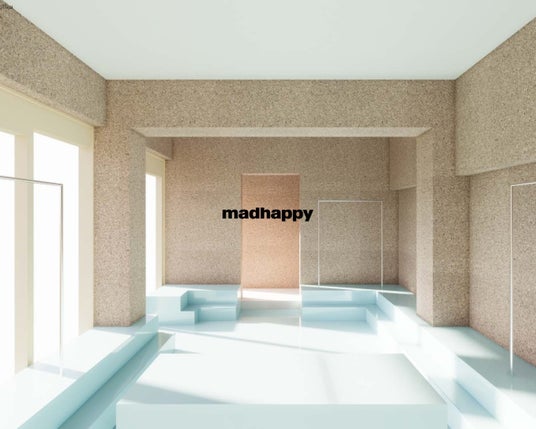 「Madhappy Tokyo Seasonal Shop は、街と人、そして買い物を結ぶ新しい形の「つながりの場」をコンセプトにデザインしました。2階建てのユニークな空間は、見知らぬ人同⼠が自然と交流し、会話が生まれる仕掛けが随所に施されており、「メンタルヘルス」をテーマにしたブランドの想いを体現しています。コーヒーショップを併設した1階は、街並みとつながるオープンプラザ。立ち寄った人が気軽に座ったり、一息ついたり、ふとしたきっかけで誰かと話せる、温かく開放的な空間です。2階は、中央に配置された大きなカウンターが象徴的なコミュニティスペース。ここでは、コーヒーを⽚手に商品を見ながら話が弾むようデザインしました」と、Social Works Studio はコメントしています。