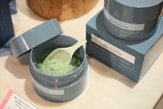 こだわりを「お風呂ではリラックしたい想いがあったので、大好きなネロリの香りを基調に、1日の疲れが癒やされるようなシトラスウッディな香りを作ってもらいました」と述べ、さらに「香りに対してこだわりが強いので『もうちょっと香り強くできますか……?』と強弱を伝えたうえで、いろいろな香りを調合してもらったので、ベルガモットやレモンなどシトラス系の香りも隠れて入っていると思います。香りで癒やされて、お塩の力で温まることができる商品になりました」とアピールしました。
