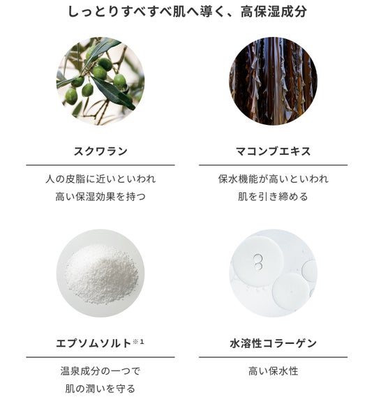皮膚刺激性がほとんど無く、安全性の高いミネラルをプラス。入浴により失われる皮膚表面の油分を補い、しっとり潤いのある肌へ導きます。