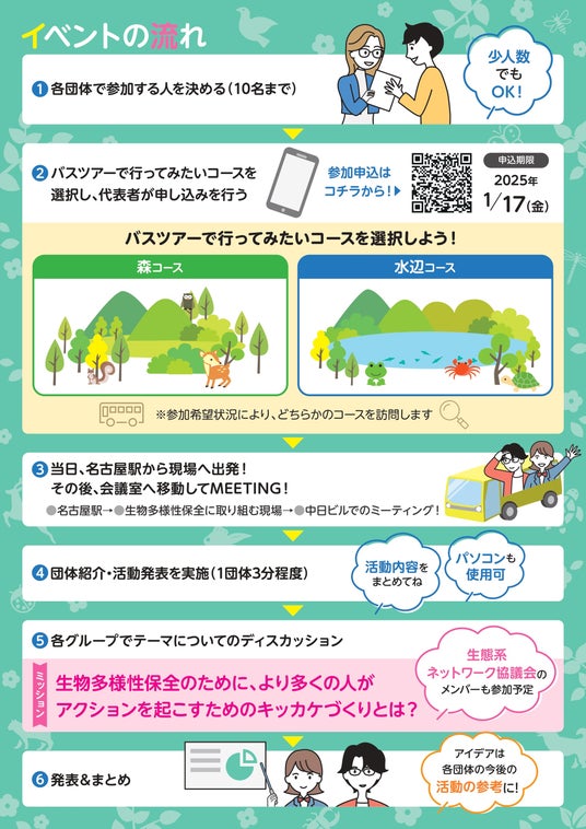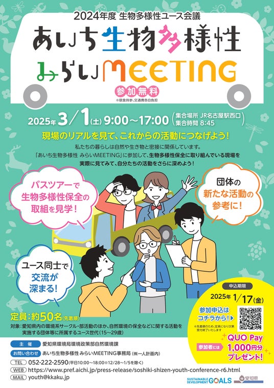 愛知県は、生物多様性保全活動を実施するユース(高校生・大学生等)団体が、日頃の取組の成果や課題を共有し、交流を深める2024年度 生物多様性ユース会議「あいち生物多様性みらいMEETING」を昨年度に引き続き、開催します。