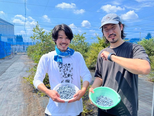 写真=ブルーベリーを摘み取るふたこビールのスタッフ