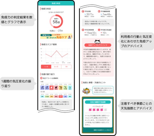 株式会社NTTドコモ(以下、ドコモ)と株式会社ベルシステム24(以下、ベルシステム24)は、気圧予報に基づく体調管理アプリ「頭痛ーる for スゴ得」(※1)(※2)にて、免疫力推定AI(※3)を活用した免疫力の変化や、気圧に応じたアドバイス等を表示する新たな機能(※4)(以下、本機能)を2024年12月3日(火)から追加いたします。