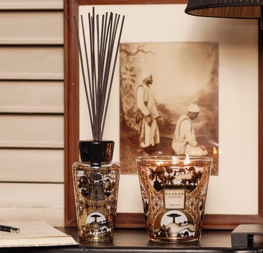 今季限定のクリスマスキャンドル「キャラバン」は古代のキャラバンをテーマに、24Kゴールドで描かれたラクダと宝物がサハラ交易の精神を表現。赤と緑のフィブラ模様がフェスティブな彩りを添え、ベルベルの地のオアシスへと誘う香りの旅が楽しめます。