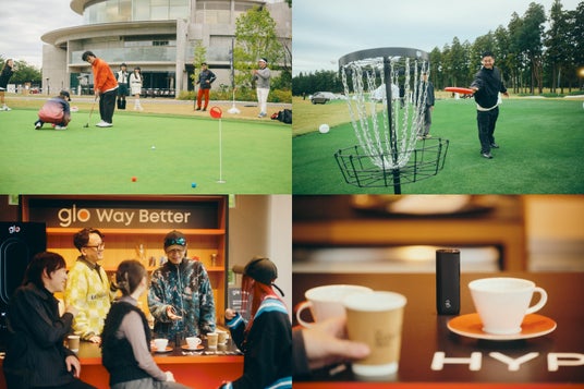 その他、15秒間で5球あるうちの1球でもパットインできれば、賞品が貰える「glo パターチャレンジ」や、フライングディスクを専用ゴールに投げ入れる「ディスクゴルフ」など、ノンゴルファーたちが楽しめるアクティビティも盛りだくさん! また、2番ホール横に常設された「glo BAR」は今回限りの装飾で彩られ、昨年発売されたばかりの新デバイス「glo(TM) HYPER pro」とともに、6種類のスティックを試せるサンプリングも実施されました。