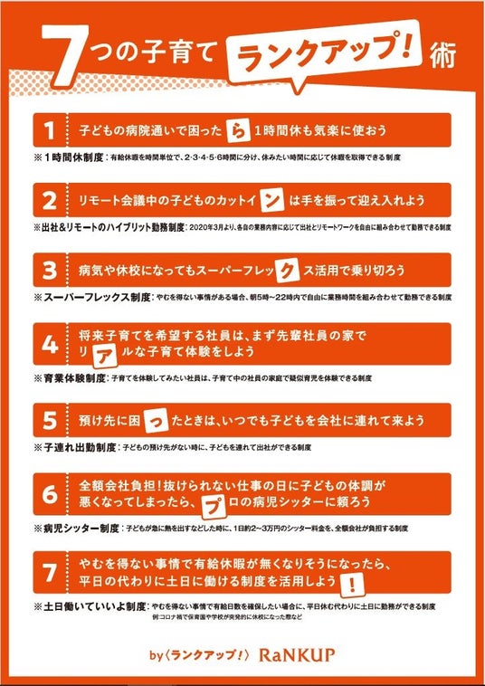 罪悪感なく社内制度を活用するため制定した「7つの子育てランクアップ!術」社内の様々な制度をより積極的に活用し、男女問わず子育てしながら働くことを理解尊重しながら、周囲への罪悪感を感じることなく快適に働いていけるよう、子育て関連の制度をまとめた社員育児憲章「7つの子育てランクアップ!術」を制定しています。