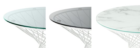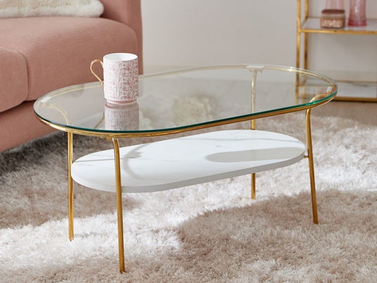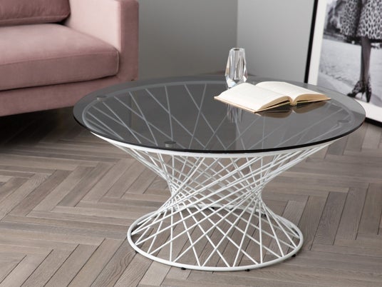見る人の視点によって大胆に表情を変える存在感のあるコーヒーテーブルです。天板はクリア、ブラックと大理石調から、脚部はゴールド、ホワイト、ブラックのそれぞれ3種類から選んで組み合わせることができます。複雑に編み込まれた繊細で高級感のある脚部が特徴的でテーブルとの距離や角度によって様々に表情を変え、空間に心地よいリズムを生み出します。天板をクリアタイプにすれば脚部の色が際立ちすっきりとスマートに、大理石調の天板はモダンな雰囲気を演出できます。編み込まれた脚部中央のスペースを生かして、中にアートフラワーやオブジェを飾るのもおすすめです。自分らしいオリジナリティ溢れるコーディネートを楽しめます。