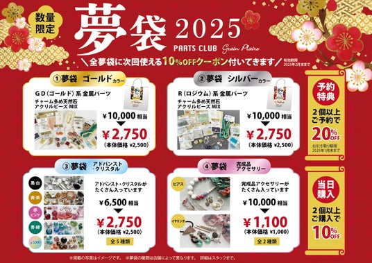 ビーズやアクセサリーパーツなどの企画・製造・販売をする株式会社エンドレス(本社:東京都台東区、代表:代表取締役 蕭(しょう)易風(えきふう))が運営する「PARTS CLUB (パーツクラブ)」 https://www.partsclub.jp/ では、ビーズ&アクセサリーパーツが詰まった「お正月夢袋2025」を新年より販売。全国のPARTS CLUB店舗では、12/1(日)よりご予約の受付をスタートしました。