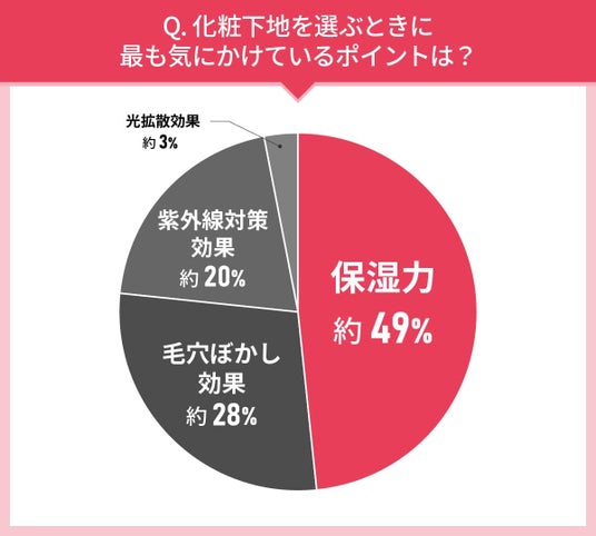 最も多かったのは、「保湿力」の約49%でした。次いで「毛穴ぼかし効果」が約28%、「紫外線対策効果」が約20%、「光拡散効果」は約3%と少ないものの、化粧下地にさまざまな効果を期待していることがうかがえます。