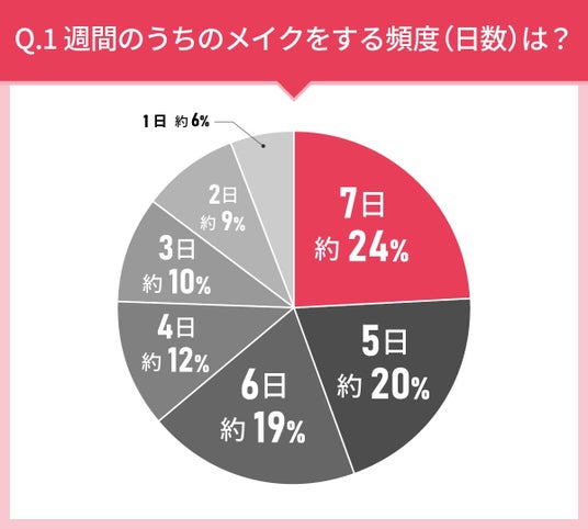 1週間のうちメイクをする日は「7日」が約24%と最も多い結果となりました。次いで「5日」が約20%、「6日」が約19%と、回答者の多くはほぼ毎日メイクをすることが分かります。
