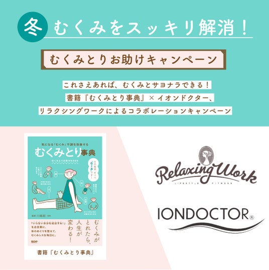 気温の低下で代謝が下がり、一年の中で最も体がむくみやすいとされる冬の季節に「むくみをなんとかしたい!」と悩む女性たちのため、この度、「むくみとりお助けキャンペーン」 の実施が予定されている。「むくみとり事典」収録の「むくみとり」アイデアをより効果的に実践するため、「むくみケアアイテム」を手掛けるイオンドクター(株式会社ジェイ・エス)と、Relaxing Work(羽立工業株式会社)の「むくみ」「不調」改善に効果的な人気アイテムを使用した「セルフケアのむくみとり方法」の紹介など本書だけの特別なコラボキャンペーンが実施される。年末年始の食べ過ぎ飲み過ぎなどによる「むくみ」予防や「むくみ」を撃退する「むくみとり」方法をぜひチェックしてほしい。詳細は、後日「むくみとり事典」公式SNSほかにて発表予定。