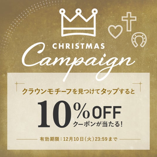 下記キャンペーン期間中に、スペシャルページ内に隠れているクラウンモチーフを見つけてタップすると、7,700円(税込)以上で使える10%OFFクーポンをGETできるチャンス!ダミーでクラウン以外のモチーフも隠れているので要注意!