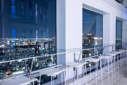 カフェには35mのガラスカウンターが併設されており、まるで空に浮かんだような感覚で夜景とカフェメニューをお楽しみいただけます。