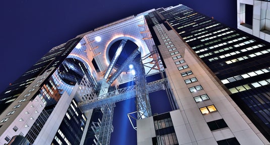 梅田スカイビルは、2棟のビルを屋上を含む上層部「空中庭園」で繋げる独特のフォルムをした世界初の連結超高層建築。