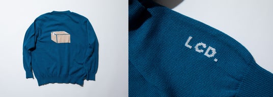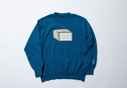 ポーチと同じくコント『井上さん』に出てくる「D2の段ボール」モチーフがフロントとバック両方に入ったニットです。袖口の「LCD.」ロゴもさりげないアクセントになっています。絶妙なブルーのカラーは着まわしやすさと、彼らの以前の衣装の色からインスピレーションを得ています。おしゃれでユニークなビジュアルは、SNSでも話題になること間違いなし!