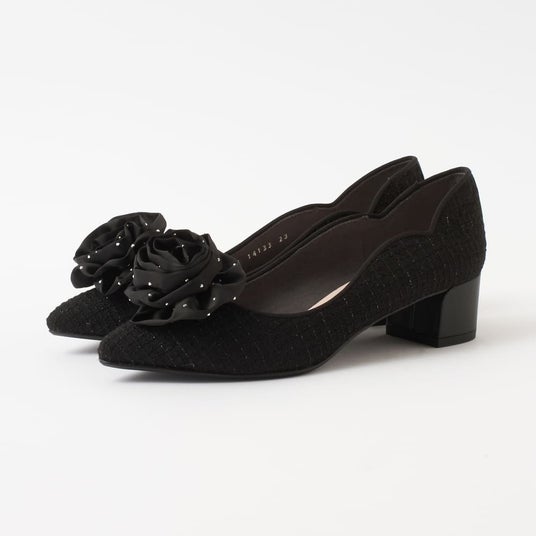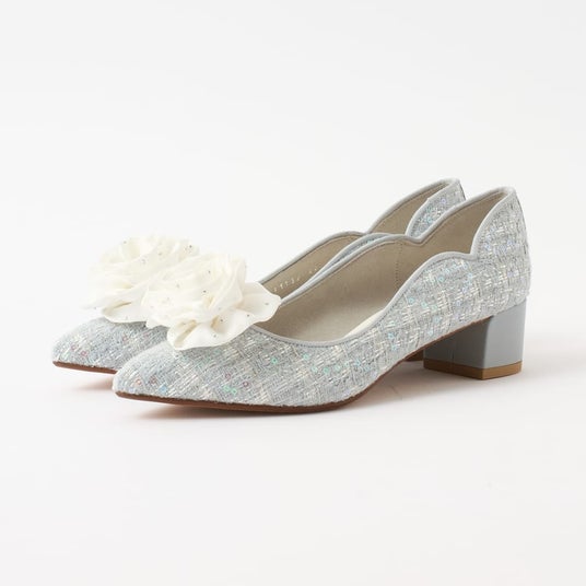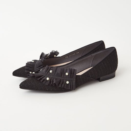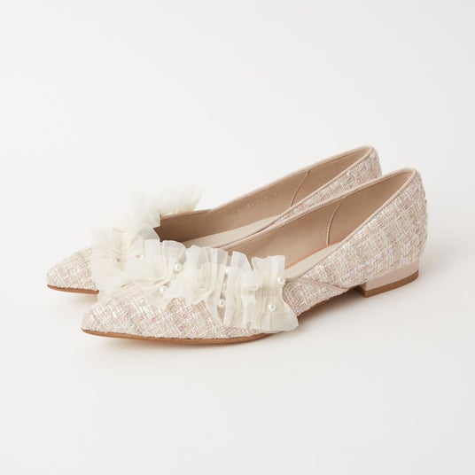 コサージュ付き2WAYパンプス、フリルフラットシューズの2モデルご用意いたしました