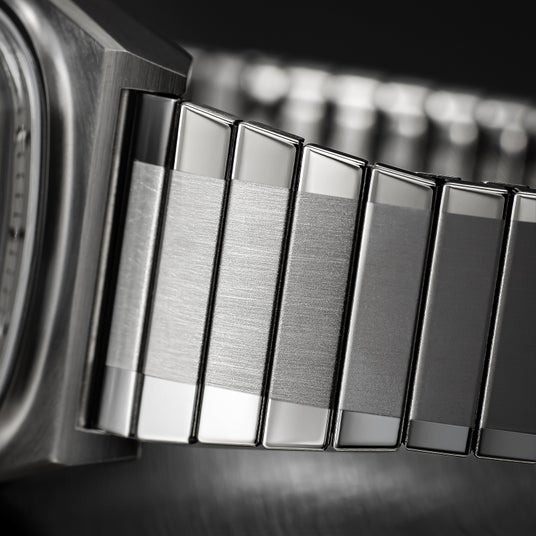 昭和レトロを彷彿とさせるブラウン管テレビをモチーフにした通称“TVダイヤル”は、変形スクエアのフェイスデザインが特徴。柔らかくカーブしたケースに大人の品格がしっかり備わるドレス顔は、今の時代に見ても新鮮に映ります。シルバーのワントーンでまとめた色使い、適度に膨らみのあるボックス型風防、加えて蛇腹式ブレスの採用と、細部まで忠実に再現することで当時の雰囲気を見事に表現。また世界的にトレンドとなりつつある小径の34mm幅ゆえ、デザインはクラシックですが決して懐古主義ではない、40年以上も前にデザインされたとは思えないほど、都会的かつ洗練された印象を持ち合わせるバランスのとれた1本です。