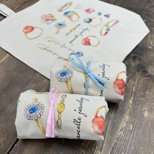 12月25日(水)、おかげさまでパーセル ジュエリーは創業11周年を迎えさせていただきます。日頃のご愛顧に感謝を込め、オリジナルのトートバッグを作成いたしました。水彩画風のイラストを厚みのあるキャンバス地にプリント。人気デザインの『ポンポネ』『ミルシェノン』『サンクルール』をイラストに起こし、表面に繊細なタッチで描きました。裏面には、ブラックオパールの遊色効果をイメージした幻想的なデザインを採用しています。12月5日(木)より、税込50,000円以上お買い上げのお客様にお渡ししております。ただし数量限定のため、なくなり次第終了とさせていただきます。