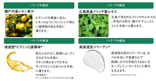 瀬戸内の穏やかな気候と豊かな自然に包まれた地”広島県瀬戸田町”。この地は日本一のレモンの産地として知られています。そんな爽やかでフレッシュな風味が特徴の「瀬戸田レモン」から抽出したレモン果汁*をエキスとして配合したハンドクリームを開発しました。太陽をたっぷり浴び、地元の人々の手で大切に育てられたレモンの恵みが、フレッシュでハリツヤあふれる透明感のある手肌へ導きます。すっきりと優しく香る、甘酸っぱいレモンの香りつきです。