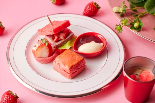 下段は、あまおうの甘酸っぱさとフレッシュさをふんだんに活かしたセイボリーをご用意しました。定番のスコーンにはあまおうのピューレを入れ、上品な味わいのクリームといちごジャムも添えました。その他、蟹とあまおうのサラダとモッツァレラチーズを詰め込んだタルトや、あまおうブレッドでサンドしたパテドカンパーニュなど、個性豊かなアレンジが光るラインアップです。