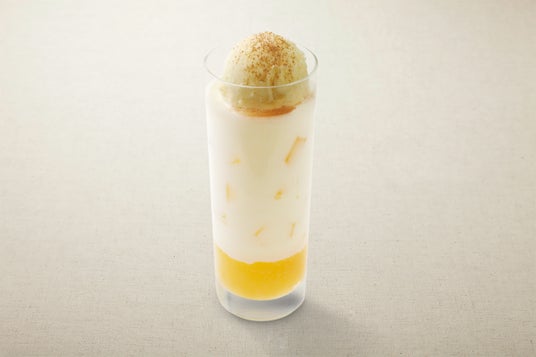 「ふじりんごフロート」480円(税込)りんごソースに牛乳を注ぎ、バニラアイスにシナモンを振りかけた、りんごのシャキシャキ感がいいアクセントに!
