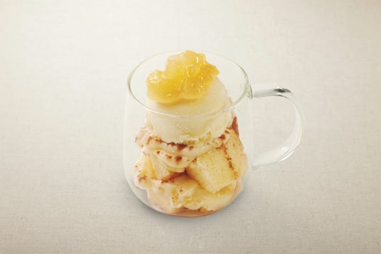 「ミニりんごパフェ」380円(税込)スフレに、りんごクリーム、バニラアイス、りんごソースを入れて、味のアクセントにシナモンを振りかけ、ミニパフェ仕立てにしました。