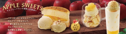 特に注目商品の「ふじりんごのスフレ」は、甘酸っぱいりんごソースをバターがしみ込んだスフレで挟み、一緒に添えたバニラアイスとりんごクリームによって、多彩な味わいを感じていただける仕立てにしております。その他にも食後に最適なサイズの「ミニりんごパフェ」やりんごのシャキシャキ感がアクセントの「ふじりんごフロート」と様々な仕立で、この時期限定のりんごスイーツをお愉しみいただけます。