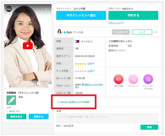 初めてレッスンを受講する講師で、「50%OFF (全教材) おすすめ講師」と表示されている講師が対象です。