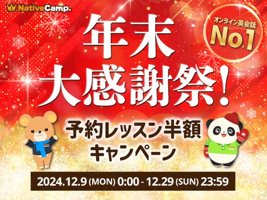 ネイティブスピーカーと回数無制限のオンライン英会話サービス「ネイティブキャンプ英会話」を展開する株式会社ネイティブキャンプ(東京都渋谷区 代表取締役:谷川国洋)は、「年末大感謝祭!予約レッスン半額キャンペーン」として2つの特別イベントを開催いたします。
