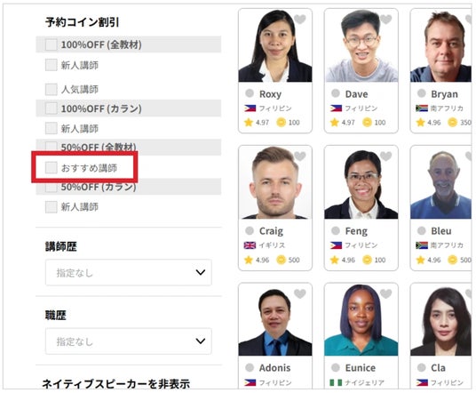 対象講師は、予約コイン割引の「50%OFF (全教材) おすすめ講師」で検索できます。