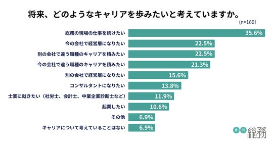 将来のキャリアについて尋ねたところ、「総務の現場の仕事を続けたい」が35.6%で最多、次いで「今の会社で経営層になりたい」「別の会社で違う職種のキャリアを積みたい」がそれぞれ22.5%となりました(n=160)。総務としてキャリアを深めたいと考える人が多い一方、他職種や経営層へのキャリアチェンジを志向する人も一定数いることがわかります。