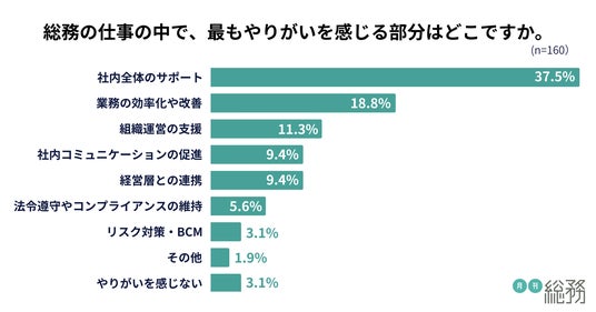 総務の仕事で最もやりがいを感じる部分については、「社内全体のサポート」が37.5%で最多、「業務の効率化や改善」が18.8%と続きました(n=160)。