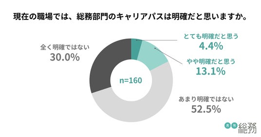 総務部門でのキャリアパスについて尋ねたところ、「とても明確だと思う」が4.4%、「やや明確だと思う」が13.1%で、合わせて17.5%に留まりました。一方で「あまり明確ではない」「全く明確ではない」と回答した人が82.5%に上り、キャリアパスの不透明さが課題として明らかになりました(n=160)。