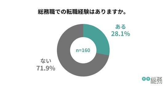 総務職として転職経験があるか尋ねたところ、「ある」と答えた人は28.1%、「ない」と答えた人が71.9%となりました(n=160)。総務職として長く同じ企業でキャリアを積む人が多いようです。