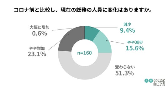 コロナ前と比較して、現在の総務部門の業務量について尋ねたところ、「やや増加」と「大幅に増加」を合わせた割合が56.9%に上り、多くの総務担当者が業務量の増加を実感していることがわかりました。一方で、51.3%が人員が「変わらない」と回答しており、業務負担が増えている可能性があることがわかりました(n=160)。