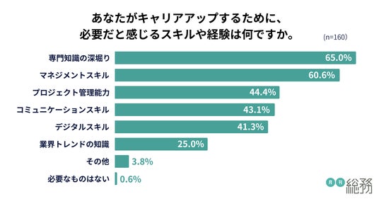キャリアアップに必要だと感じるスキルについては、「専門知識の深堀り」が65.0%で最多、続いて「マネジメントスキル」が60.6%、「プロジェクト管理能力」が44.4%と続きました(n=160)。業務を支える専門性や管理能力が重視されています。