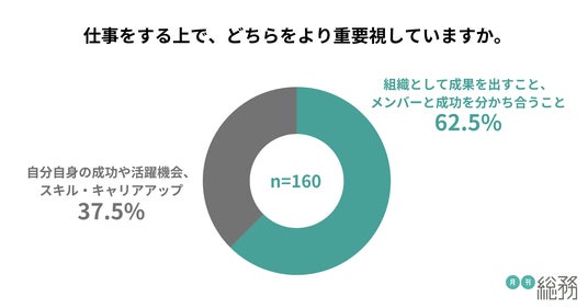 仕事をする上で重視する点については、「組織として成果を出すこと、メンバーと成功を分かち合うこと」が62.5%、「自分自身の成功やスキル・キャリアアップ」が37.5%と、組織全体の成功を優先する姿勢が見られました(n=160)。