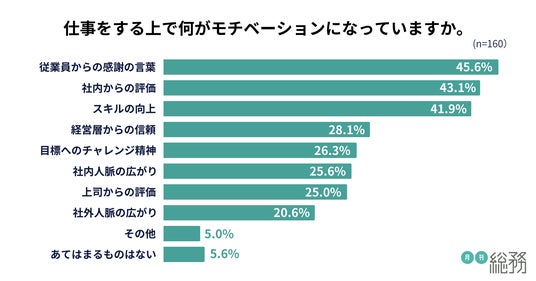 仕事をする上でのモチベーションについては、「従業員からの感謝の言葉」が45.6%で最多、「社内からの評価」が43.1%、「スキルの向上」が41.9%と続きました(n=160)。