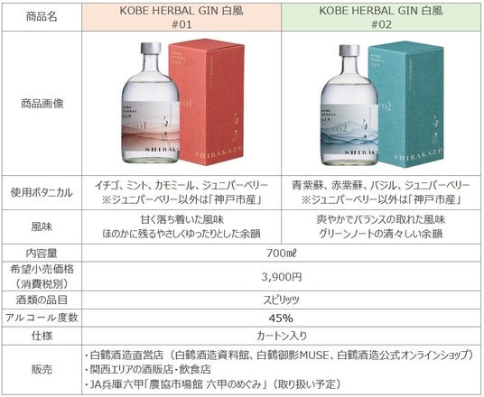 「KOBE HERBAL GIN 白風 #01」には、イチゴ、ミント、カモミールを、「KOBE HERBAL GIN 白風 #02」には、青紫蘇、赤紫蘇、バジルを使用しています。また、仕込みには日本酒の仕込みに使う六甲山系の伏流水を使用しています。