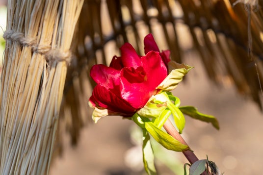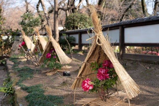 冬の厳しい環境から保護する為、開苑中の冬咲きぼたんは“わらぼっち”に包まれています。
