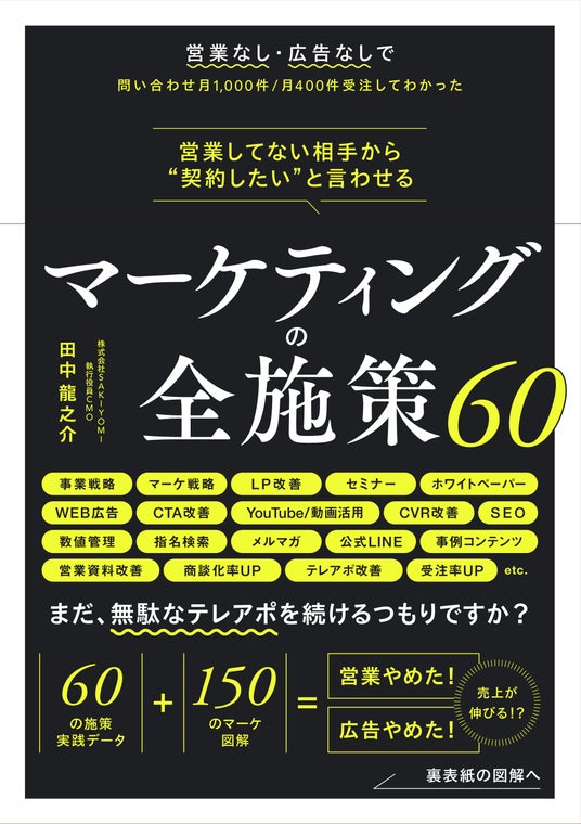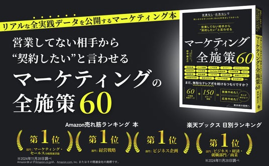 株式会社SAKIYOMI(大阪市北区、代表取締役社長:吉田 睦史)の執行役員CMOである田中龍之介の書籍『営業してない相手から“契約したい”と言わせる マーケティングの全施策60』(2024年11月25日(月)発売)がAmazon・楽天ブックスの複数部門で販売ランキング1位を獲得しました。