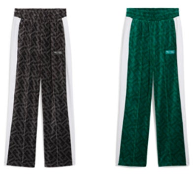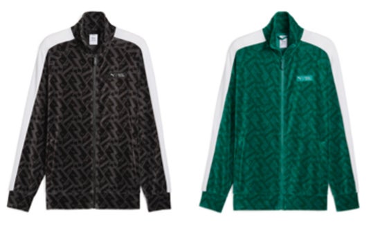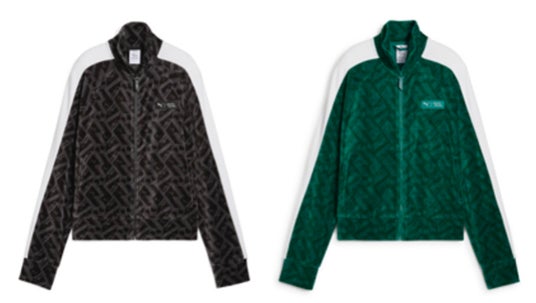 プーマのアイコニックなT7トラックジャケットとT7トラックパンツは、劇中で印象的に描かれている階段迷路をモチーフにしたカスタムパターンでリメイクしました。出場者が着用する緑のユニフォームを彷彿とさせるこのトラックスーツは、ベルベット素材で作られ、プーマキャットとイカゲームのロゴが施されたチェストラベルや、特別にデザインされたタグが特徴的です。