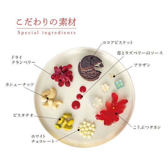 砂糖(国内製造)、乳等を主原料とする食品(生乳、乳清、クリーム)、クリーム、ココアクッキー、いちごピューレ、カシューナッツ、ラズベリー、ホワイトチョコレート、ドライクランベリー、ピスタチオ、寒天、かぼす果汁、りんご果汁、カシスリキュール、アラザン、ミント、シナモン/安定剤(加工デンプン、ペクチン、カラギナン)、乳酸、膨張剤、乳化剤、香料、酸味料、酸化防止剤(V.C、V.E)、トレハロース、着色料(スピルリナ青、クチナシ黄、アントシアニン、ビートレッド、ウコン、銀)、(一部に乳成分・小麦・大豆・カシューナッツ・りんご・オレンジを含む)