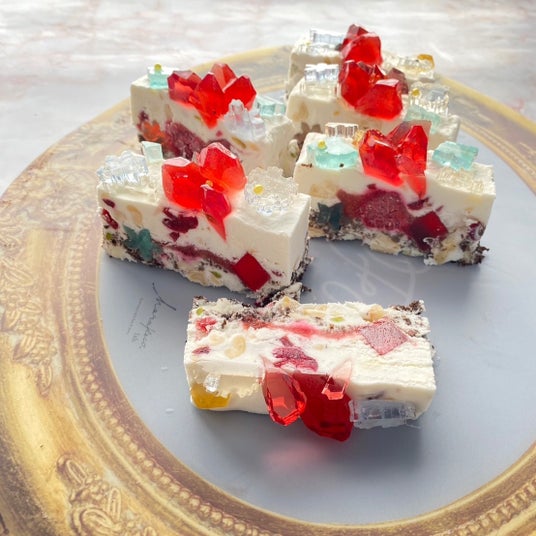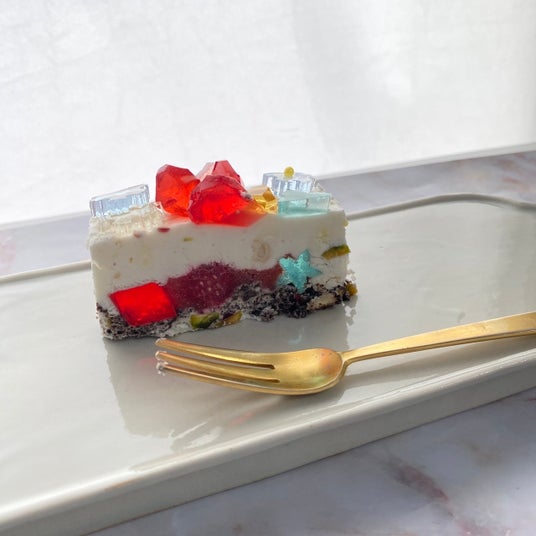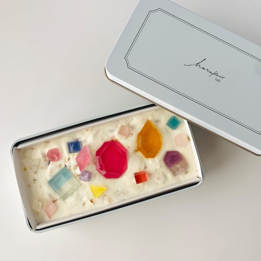「宝石のカッサータ」は、厳選された素材を贅沢に使用したカッサータの中に、ハラペコラボが作る鉱物みたいな琥珀糖「こうぶつヲカシ」が隠れています。チーズとクリームの白に映える色味のこうぶつヲカシは、どこをカットしても断面が透明で光があたるとキラキラと輝く宝石のように美しい仕上がり。