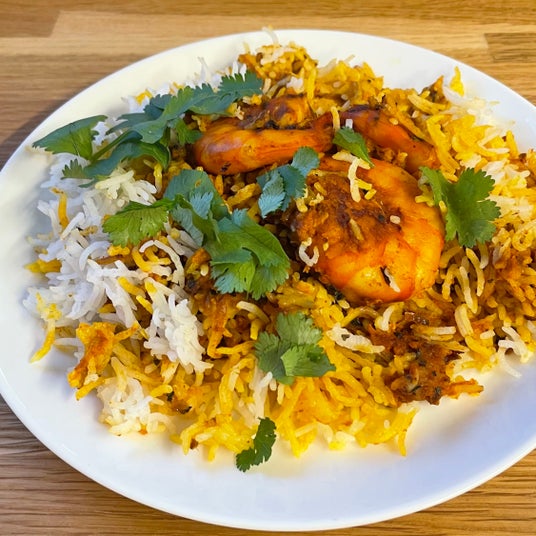 2品目は ブラックタイガービリヤニ。ぷりぷりで肉厚なブラックタイガーエビを3尾(調理後約4cm)使用し、エビの旨みと食感を存分に楽しめる贅沢な一皿です。エビ好きの方におすすめの、1人前2500円の特別なビリヤニです。